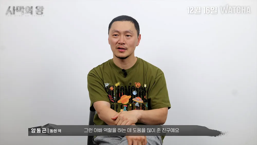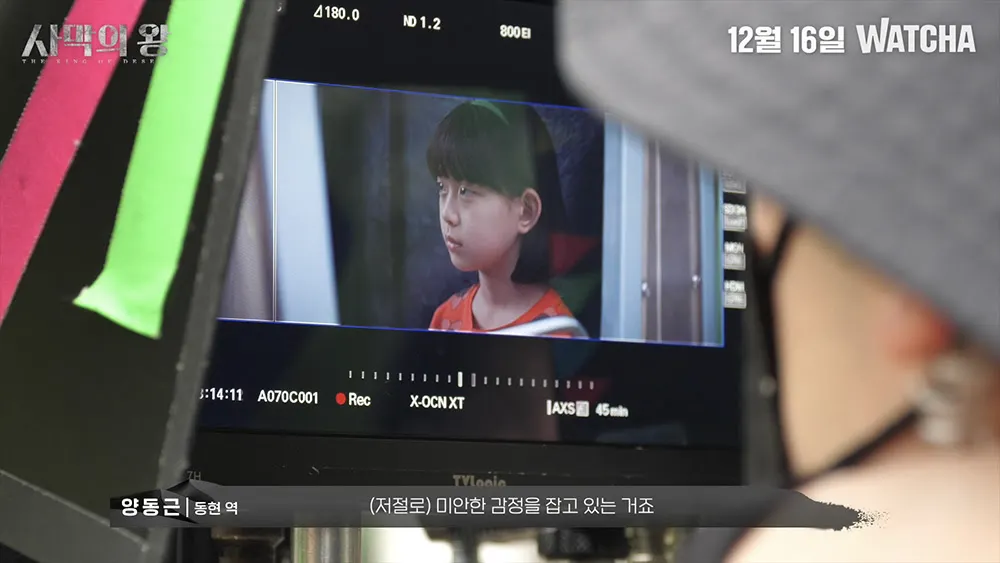 이번에 공개된 영상은 얽히고설킨 관계를 통해 점점 확장되는 <사막의 왕>의 세계관을 완성한 배우들의 활약을 확인할 수 있어 흥미를 불러일으킨다. 먼저, 김보통 작가는 “카메라 한 부분에 걸치는 장면에서도 혼신의 힘을 다해서 연기를 한다”라며 12시간 뒤 죽음을 앞둔 아빠 ‘동현’ 역을 맡은 양동근의 섬세한 연기력에 대해 찬사를 전했다. 이어, “‘아 정말 배우다’라는 생각을 했다. 현장에 왔을 때 본인이 당일 그 캐릭터가 돼서 왔다”라고 전한 김보통 작가는 ‘돈이면 다 된다’라는 신념을 지닌 ‘사장’의 무자비함을 뛰어난 캐릭터 소화력으로 선보일 진구의 열연에 대해 기대케 했다. 또한, “기존 장동윤 배우가 가진 이미지는 꽃미남 캐릭터가 되게 강하다. 근데 그렇지 않은 모습을 너무 능수능란하게 보여줬다”라며 장동윤의 새로운 연기 변신에 대해 극찬을 쏟아냈다. 한편, 진구는 한물간 유튜버 ‘현숙’ 역의 김재화에 대해 “그분 특유의 카리스마 덕분인지 (멋있었다)”고 말해 압도적인 존재감으로 작품의 몰입도를 끌어올릴 김재화의 활약을 예고했다. “괴물 같은 배우다”라는 짧고 강렬한 말로 이홍내를 소개한 김보통 작가와 “진지하고 프로답게 준비를 철저히 해온다”라며 정이서를 향한 믿음을 드러낸 진구, 마지막으로 “표정을 보고 있으면 미안한 감정을 잡게 된다. 아빠 역할을 하는 데 도움을 많이 준 친구”라고 박예린과의 연기 호흡에 대한 소감을 전한 양동근의 말은 자타공인 연기파 배우들의 최고의 팀워크와 연기 시너지로 완성될 <사막의 왕>에 대한 궁금증과 기대감을 동시에 자극한다.