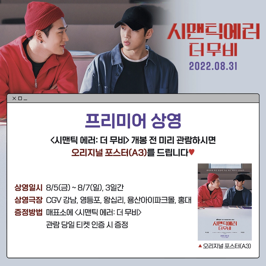 이처럼 뜨거운 사랑을 얻고 있는 <시맨틱 에러: 더 무비>가 부천국제판타스틱영화제 이후 처음으로 공개되는 프리미어 상영회를 확정, 영화의 개봉을 손꼽아 기다려 온 팬들의 만족감을 더해줄 예정이다. <시맨틱 에러: 더 무비> 프리미어 상영회는 8월 31일(수) 정식 개봉에 앞서 오는 8월 5일(금)부터 7일(일)까지 CGV 강남, 영등포, 왕십리, 용산아이파크몰, 홍대 총 5개의 극장에서 진행되며, 8월 1일(월)부터 CGV 홈페이지 및 모바일 앱을 통해 예매가 가능하다. 특히 해당 상영회를 통해 영화를 관람하는 관객 전원에게 극장 개봉을 맞아 새롭게 공개된 극장판 오리지널 포스터가 선물로 마련되어 더욱 뜨거운 반응이 예상된다.