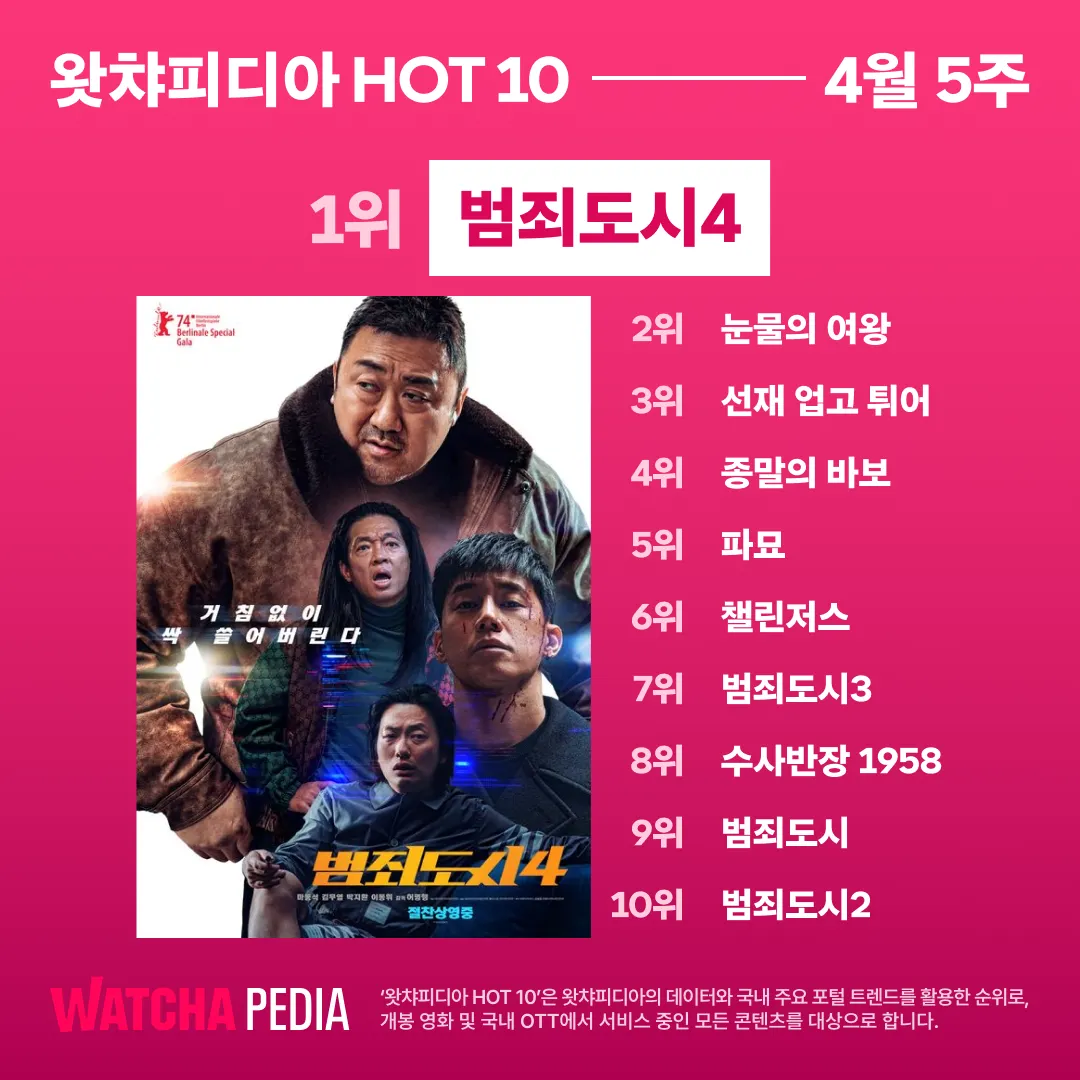 4월 5주차 왓챠피디아 HOT 10 1위는 전주에 이어 영화 <범죄도시4>가 차지했다. <범죄도시4>는 올해 최고 오프닝을 포함해 최단기간 100만, 200만, 300만, 400만 관객 돌파 등 파죽지세 흥행 추이를 보이며 대한민국 대표 프랜차이즈 액션 영화다운 압도적인 화제성을 입증하고 있다. 특히 <범죄도시2>, <범죄도시3>에 이어 <범죄도시4>도 천만 관객을 동원한다면 ‘시리즈 트리플 천만’ 달성이라는 전무후무한 기록을 세우게 되어 기대를 모은다. 왓챠피디아 내에서도 뜨거운 인기에 힘입어 <범죄도시4>를 필두로 <범죄도시> 시리즈 전편이 10위권 내에 진입하는 쾌거를 이뤘다.