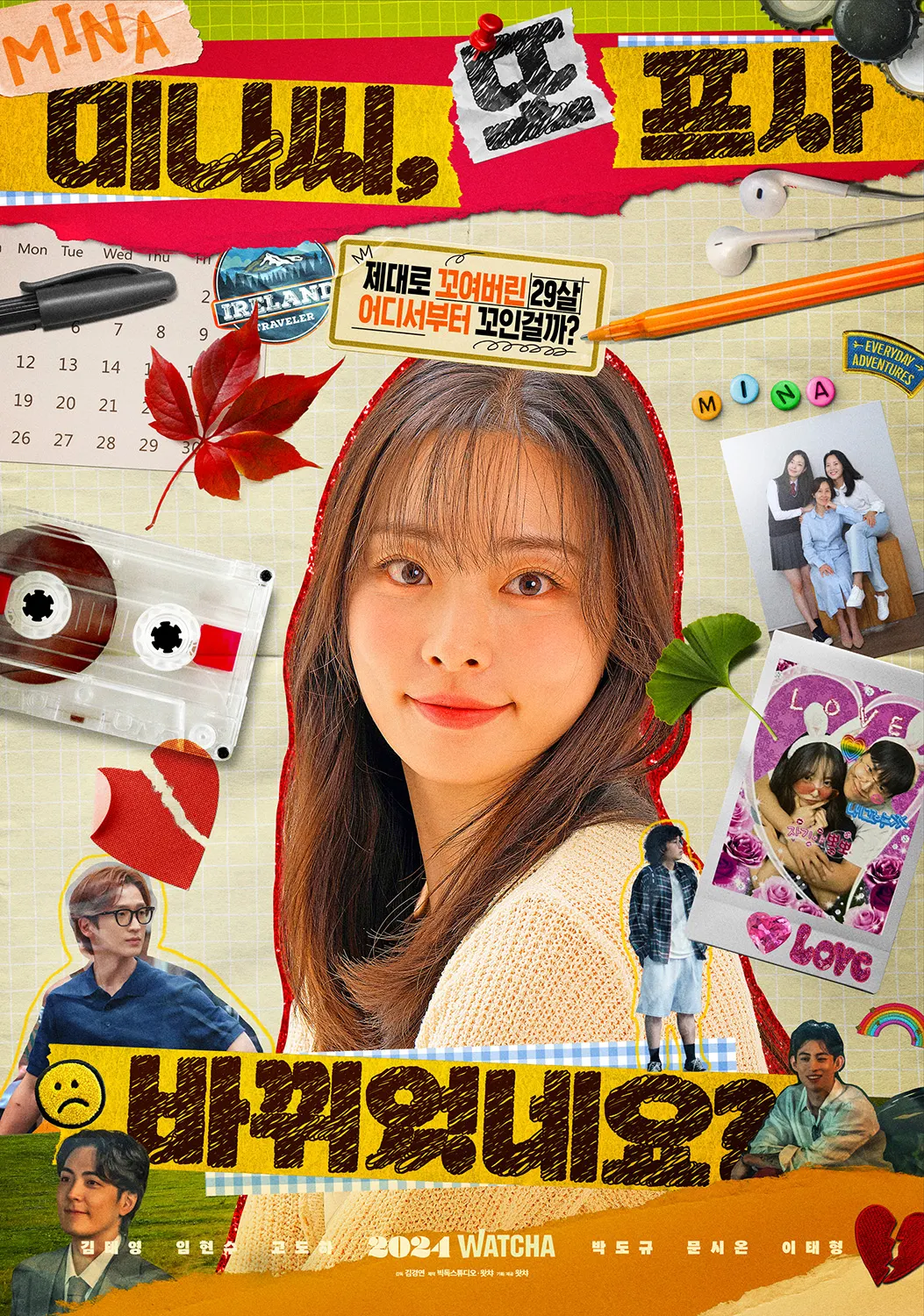 이번에 공개된 <미나씨, 또 프사 바뀌었네요?>의 스페셜 포스터는 ‘다꾸’(다이어리 꾸미기) 콘셉트로, 주인공 미나의 다채로운 순간을 아기자기하게 담아냈다. 산뜻한 미소를 지으며 정면을 응시하는 미나를 중심으로, 미나의 가족들과 전 남자친구 5명이 곳곳에 배치되어 눈길을 끈다. 카세트테이프와 단풍잎, 찢어진 하트 모양 스티커 등 다꾸 감성이 가득한 요소들도 보는 재미를 더한다.