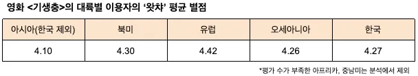 유럽 이용자들에게도 ‘기생충’(4.42점)은 2위 ‘아이리시맨'(4.36점)을 제치고 가장 높은 평가를 받은 작품이었다. 유럽 이용자들의 평가수가 부족한 ‘1917’, ‘조조래빗’, ‘작은 아씨들’은 비교에서 제외했다. 단, 아시아에서는 ‘기생충’보다 ‘조조래빗’(4.18점)과 ‘포드 V 페라리'(4.11점)가 더 높은 평가를 받았다.