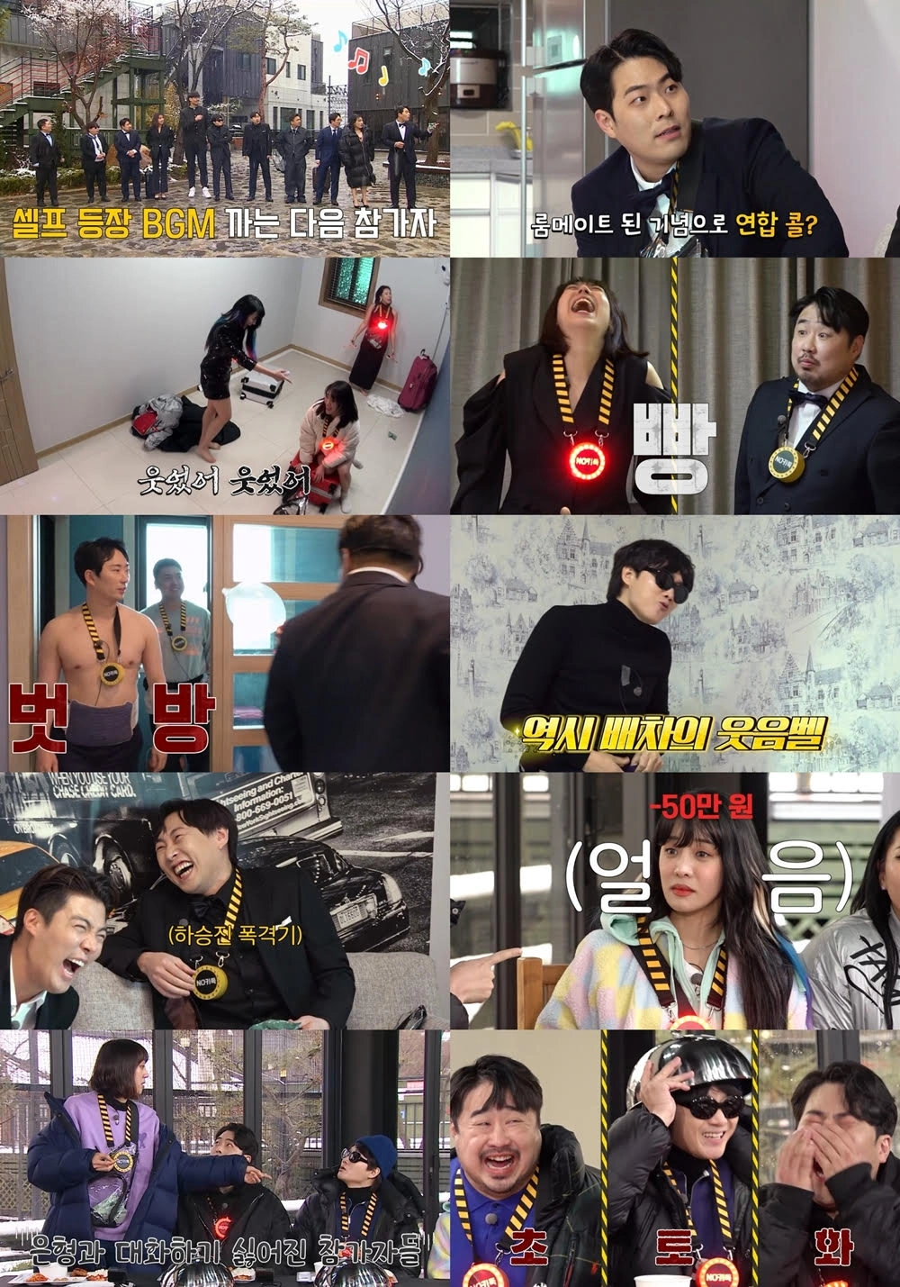 특히 강재준과 이은형은 코미디언 부부다운 19금 애드리브로 현장을 뒤흔들었다. 피임 기구를 챙겨오는 등 남다른 준비성으로 입을 떡 벌어지게 만든 이은형은 촬영 중에도 끈적한 눈빛을 보내며 남편 강재준마저 질겁하게 했다. 그런가 하면 곽범과 이창호는 키득머니를 빼앗기 위해 이들 부부의 방에 찾아갔다가 본의 아니게 부부싸움을 관전하는 등 멘탈이 탈탈 털리는 수모를 겪었다. 이어진 식사 시간에 이은형은 귀이개를 이용해 분비물 개그를 시전하며 모두의 경악을 자아냈다. 이에 강재준은 “나 오늘 이혼했어”라고 재빠르게 아내를 손절하는 모습으로 또 한 번 보는 이들을 포복절도하게 했다.