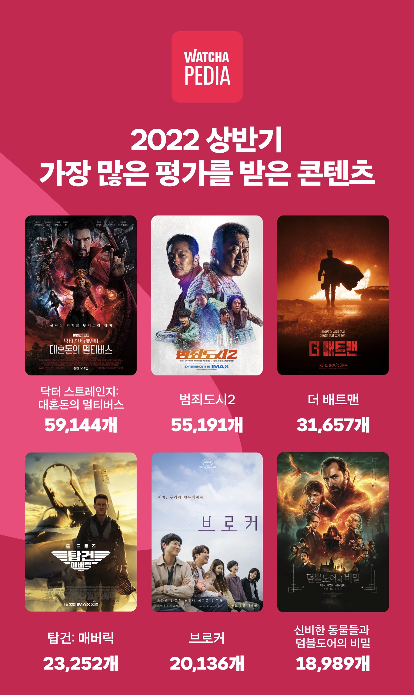 이 밖에 ▲ ‘더 배트맨’(31,657개) ▲ ‘탑건: 매버릭’(23,252개) ▲ ‘브로커’(20,136개) ▲ ‘신비한 동물들과 덤블도어의 비밀’(18,989개) 등 상반기 극장 흥행을 견인한 텐트폴 영화들이 많은 별점 평가를 받은 것으로 나타났다. 특히, 탑건은 불과 6월 22일에 개봉한 신작임에도 별점 평가수 4위에 안착하며 뜨거운 화제성을 입증했다.