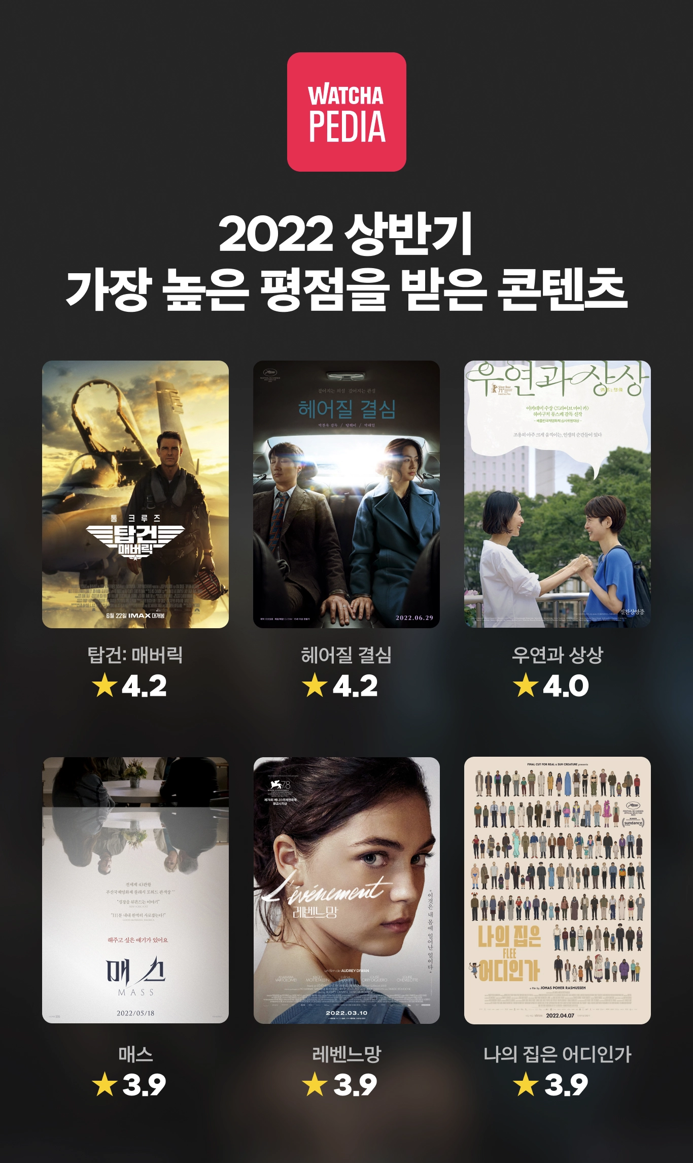 이어 ▲ ‘드라이브 마이 카’로 제94회 아카데미 국제장편영화상을 수상한 하마구치 류스케 감독의 신작 ‘우연과 상상’(3.98점) ▲ 아이를 잃은 두 부부의 이야기를 담은 ‘매스’(3.88점) ▲ 제78회 베니스국제영화제에서 심사위원 만장일치로 황금사자상을 수상한 ‘레벤느망’(3.88점) ▲ 아프간 출신 난민의 이야기를 다룬 ‘나의 집은 어디인가’(3.88점) 등 독보적인 작품성과 다양성을 갖춘 영화들이 두각을 나타냈다. ‘레벤느망’과 ‘나의 집은 어디인가’는 왓챠 익스클루시브로 공개돼 많은 사랑을 받았다.