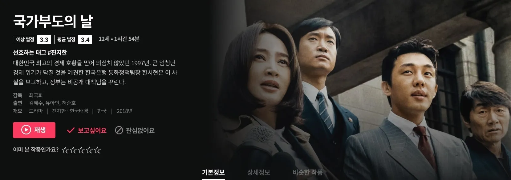 1997년 IMF 외환위기를 본격적으로 다룬 최초의 영화다. 국가부도까지 남은 일주일, 위기를 막으려는 사람과 위기에 베팅하는 사람, 그리고 회사와 가족을 지키려는 평범한 사람 등, IMF 위기 속에서 서로 다른 선택을 했던 사람들의 이야기를 그려냈다. 김혜수, 유아인, 허준호가 열연을 펼쳤다.