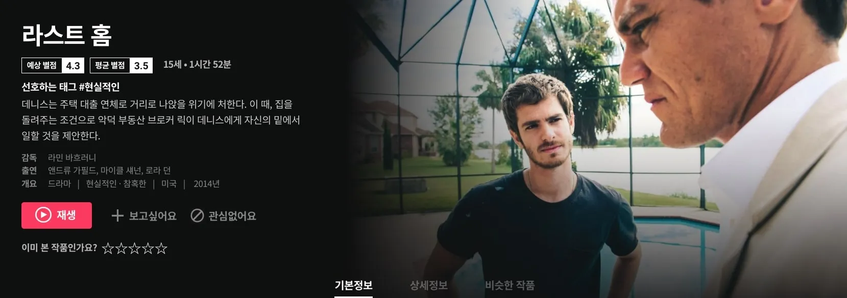 ‘마진 콜'이나 ‘인사이드 잡’이 월가의 실체를 파헤친다면, ‘라스트 홈’은 금융위기의 여파를 온 몸으로 겪게 되는 평범한 시민의 삶을 그린다. 글로벌 금융위기의 출발이 된 서브프라임모기지 사태로 인해 단 2분 만에 모든 것을 잃고 홈리스로 전락한 데니스를 앤드류 가필드가, 이런 데니스를 이용해 한몫 챙기려는 부동산 브로커 릭을 마이클 섀넌이 연기했다.