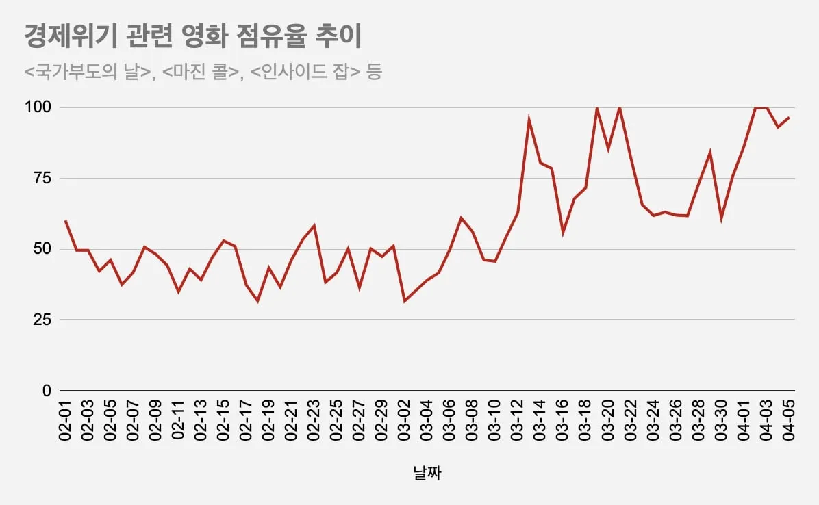 대신, 경제위기를 다룬 영화들에 대한 관심은 상승하고 있다. 현재 경제위기 관련 영화의 시청점유율은 3월 초 대비해 한달 만에 3배 이상 증가했다. 1997년 IMF 외환위기를 다룬 영화 ‘국가부도의 날’은 3월13일 시청 순위 100위권에 진입해 이후 최고 12위까지 올랐다. 2008년 글로벌 금융위기를 다룬 영화 ‘마진 콜: 24시간, 조작된 진실’(이하 ‘마진 콜’)도 전달 대비 시청량이 15배 이상 늘어나면서 계속 순위가 올라 최고 21위를 기록했다. 이 외에도 글로벌 금융위기의 진실을 파헤친 다큐멘터리 ‘인사이드 잡', 금융위기로 인해 홈리스가 된 사연을 영화로 그려낸 ‘라스트 홈’ 등의 인기도 계속 오르고 있다.